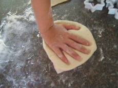 Add more water if it is too difficult to handle or more flour if it is too runny. To make the handprints : Roll the dough out until it is about 3 cm thick (approximately 1 inch) - you can place it inside a picture frame, if you're making more than one handprint, so that it forms a perfect rectangle. Place your child's right hand on the dough and firmly press it down into the dough.
