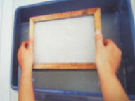 Dipping the Paper Mould and frame The action for collecting the pulp on the sieve is very important. If it is not lowered and lifted smoothly, the pulp will settle unevenly. The frame and sieve must be held firmly and lowered from a vertical position over the basin to a horizontal position underneath the water's surface. Hold the mould at a slight angle as it breaks through the surface into the pulp mix, and then straighten it as you lift it up and out of the pulp.