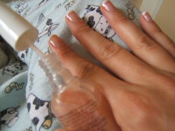 For a french manicure: Carefully paint the white line by working on a solid surface like a dining room table. I find the secret is to keep the hand holding the brush still, touch the brush to the tip of your nail while turning the nail being painted slowly - this creates a neater white line. Let it dry completely.